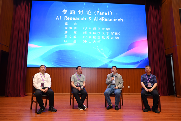 在随后的专题讨论中,周傲英、熊辉、吴文峻、印鉴四位专家围绕“AI Research & AI4Research”的主题,进行了分享。他们结合了自己的研究经历,介绍了AI时代自己研究范式和研究方法上的转变,分享了自己对于AI研究趋势的看法,对于如何善用AI工具、转变思维定势、激发研究活力等给出了建议。