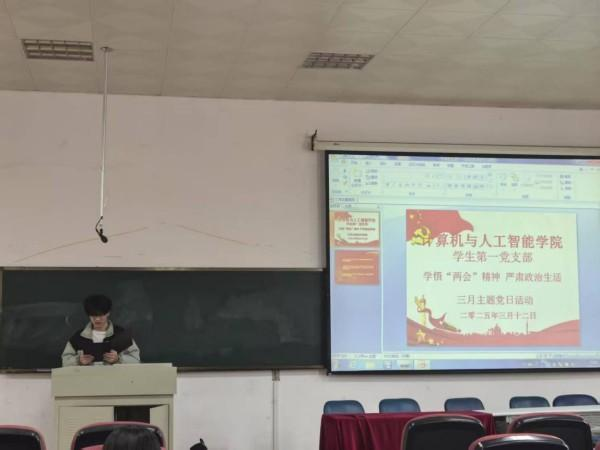 2025年3月12日,91视频 学生第一党支部于D107教室开展了以“学悟‘两会’精神 严肃政治生活”为主题的党日活动。此次活动由党支部书记唐盛主持,全体党员共同参与,旨在深入学习重要文件精神,提升党员的思想认识与责任担当。