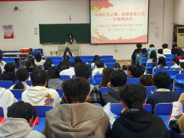 为传承红色基因,弘扬革命精神,引领青年学子在红色旋律中汲取奋进力量,2025年10月25日,91视频 本科生第一党支部在大学生活动中心D101举办“唱响红色之歌,绽放青春之花”红歌赛活动。活动通过红歌演唱与党史知识互动结合的形式,为师生呈现了一场沉浸式的红色文化盛宴,支部党员、入党积极分子及学生代表共100余人参与。
