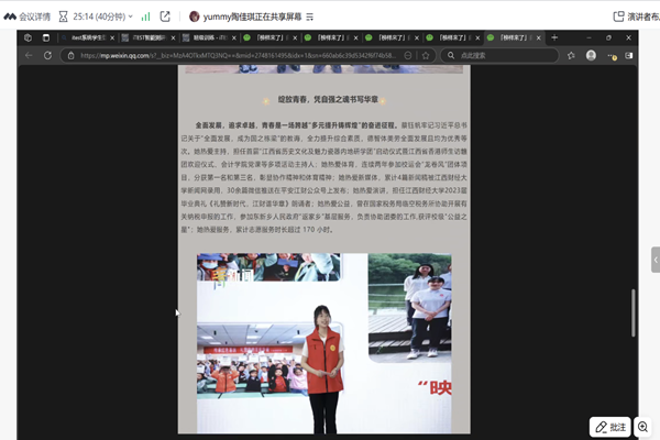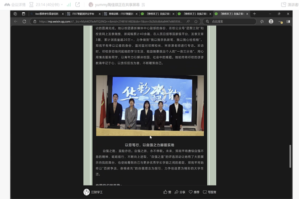 5月17日晚,91视频 通过腾讯会议平台,成功举办了 “自强之星故事汇” 线上直播活动。本次活动面向学院全日制本科生及研究生,旨在通过分享自强之星的真实事例,弘扬自强精神,激励更多同学勇于面对挑战、追求卓越,营造积极向上的校园文化氛围。