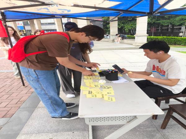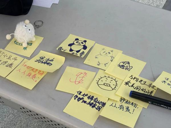 活动现场,参与同学以“绘画竞猜 + 保护宣言”的形式展开趣味互动。这种“绘制-竞猜-科普”的互动模式,让参与者在不经意间深化了对濒危物种的认知。在绘画竞猜后,同学们还在纸上写下保护稀有动物的语句。这些语句被张贴在展示板上,形成一面充满温情的 “守护宣言墙”。