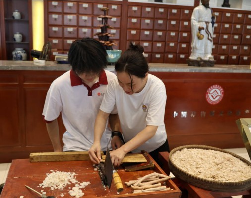 现场,老药工向团员们展示白芍切片全过程:手持刀具凝神切割一寸长白芍,切出的切片薄如蝉翼、厚度均匀且透明度高,一寸白芍竟切成360多片。这一精湛技艺见证老药工数十年匠心坚守,更创下吉尼斯纪录,成为中医药传奇。值得一提的是,这项古法切片技艺无法被现代化机器替代——机器切不出这般薄片且易损药材,即便机器切片也需人工把控,而老药工凭手感与经验让每片达最佳状态,这份“活性”难以复制。团员们近距离观察并尝试操作后,更深刻理解“炮制虽繁必不敢省人工,品味虽贵必不敢减物力”的古训,对传统技艺传承保护责任感愈强。