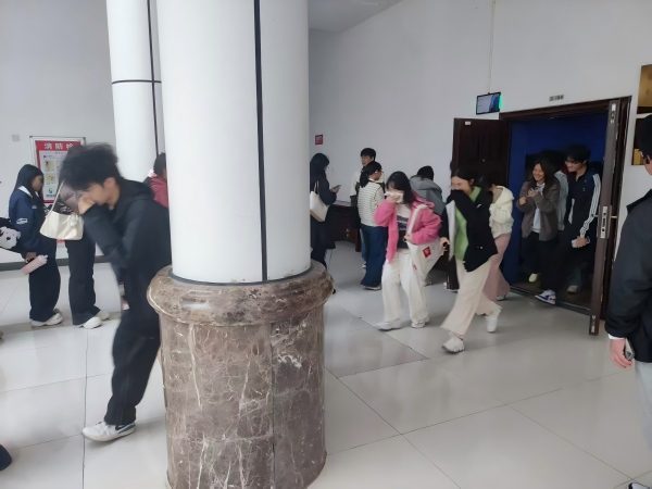 当指导者发出演习信号后,大学生活动中心D108现场烟雾弥漫。同学们立刻用湿毛巾捂住口鼻,弯腰低姿,在指引者的引导下,沿着预定逃生路线快速、有序地向指定位置集合点撤离。途中,指导员们分工明确,有的在前引路,有的在后方护尾,提醒同学们不推挤、不慌张、不逗留。