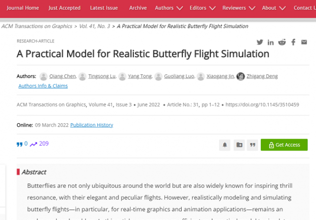 近日,信息管理学院数字媒体与虚拟现实科研团队陈强博士以第一作者身份在计算机图形学领域国际权威期刊ACM Transactions on Graphics发表论文“A Practical Model for Realistic Butterfly Flight Simulation”。该文章是我省在该期刊发表的首篇论文,是91视频 在计算机图形学、VR研究领域取得的又一重大进展。
